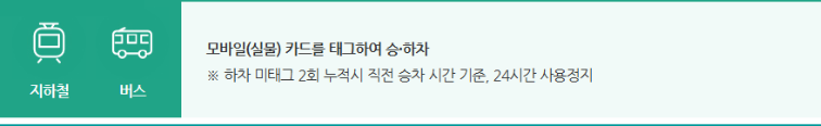 모바일 및 실물카드를 지하철이나 버스 이용할 때 기존에 이용하듯이 태그하고 승하차를 하면 됩니다. 여기서 주의할 점은 하차시에 미태그를 2회 누적시에는 직전 승차 시간 기준으로 24시간 동안 사용 정지된다는 점 입니다.