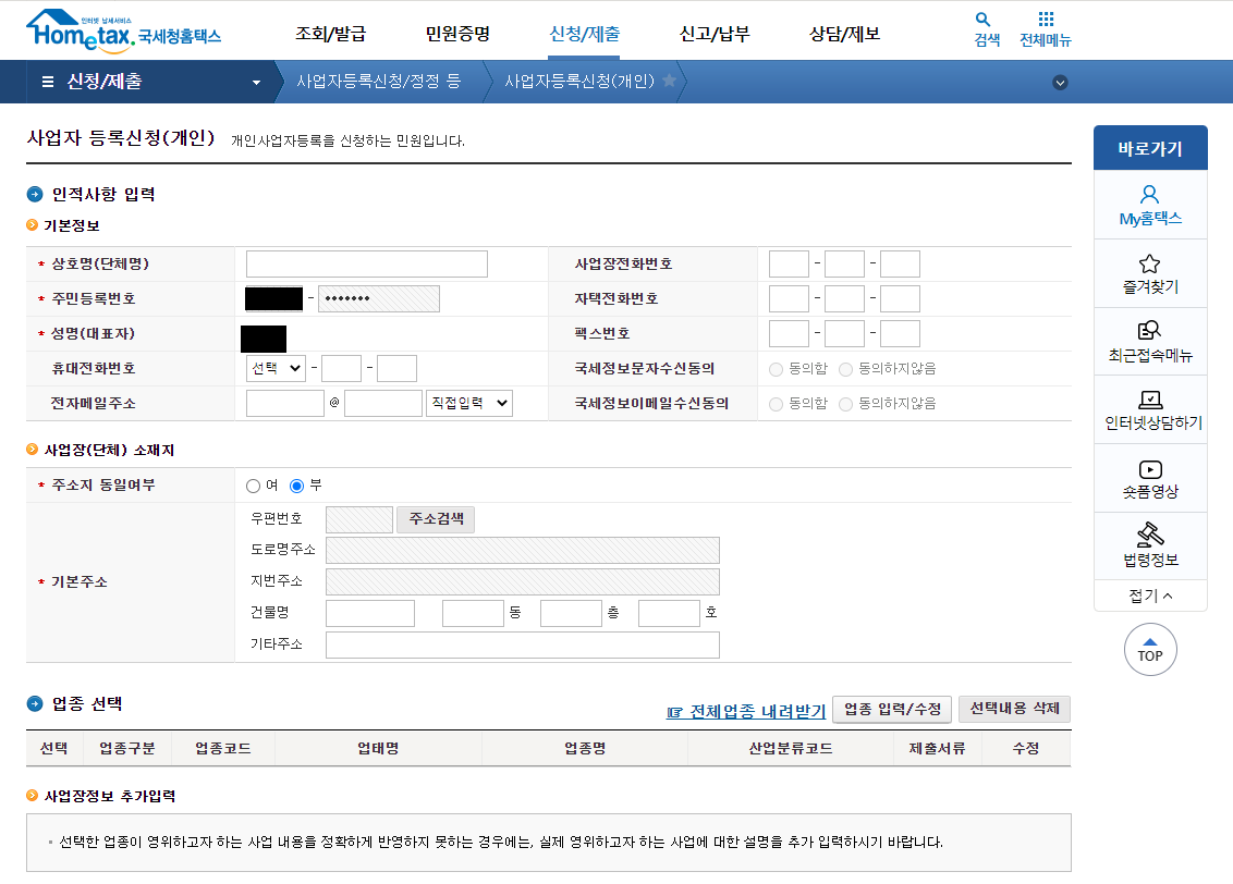 (참조 : “홈택스 ( https://www.hometax.go.kr ) → 신청/제출 → 사업자등록신청/정정 등”)