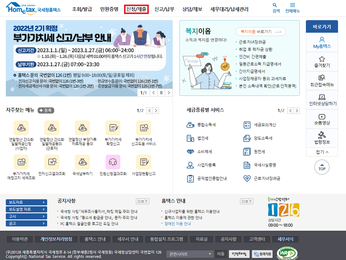 국세청홈택스에 로그인 후 신청/제출을 클릭하고,