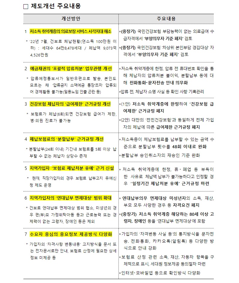 국민권익위원회가 권고한 개선방안에는 국민건강보험 부담 능력이 없는 의료급여 수급자격에서 '부양의무자 기준 폐지'검토, 예금채권의 '포괄적 압류 처분'업무관행 개선, 건강보험 체납자의 '건강보험 급여제한' 근거규정 폐지 등의 내용이 담겨있다.