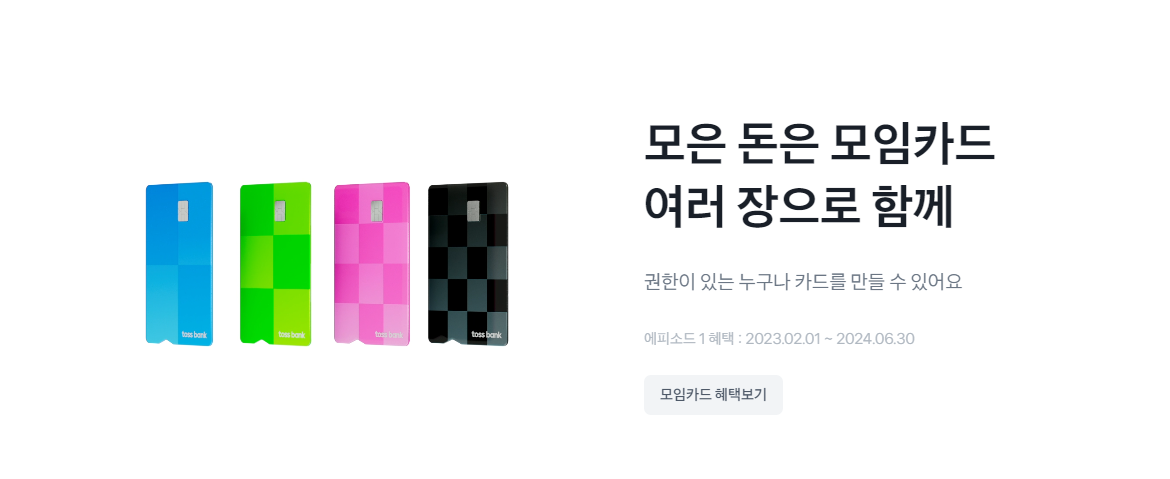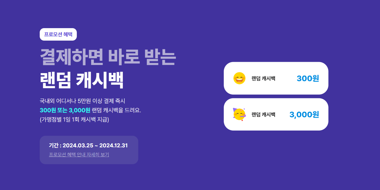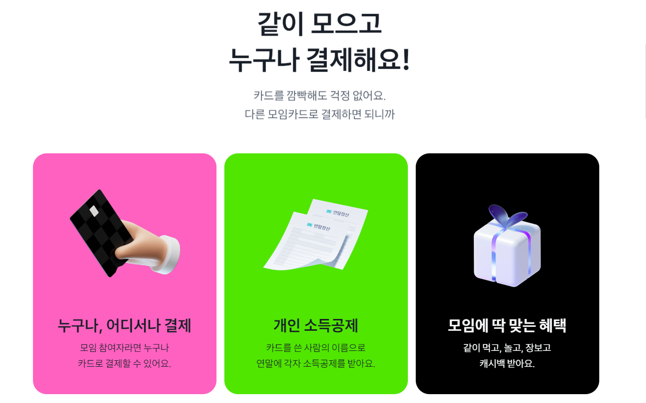 | 혜택 | 모임체크카드의 경우 건당 5만원 이상 결제시 300원 또는 3,000원 랜덤 지급 |