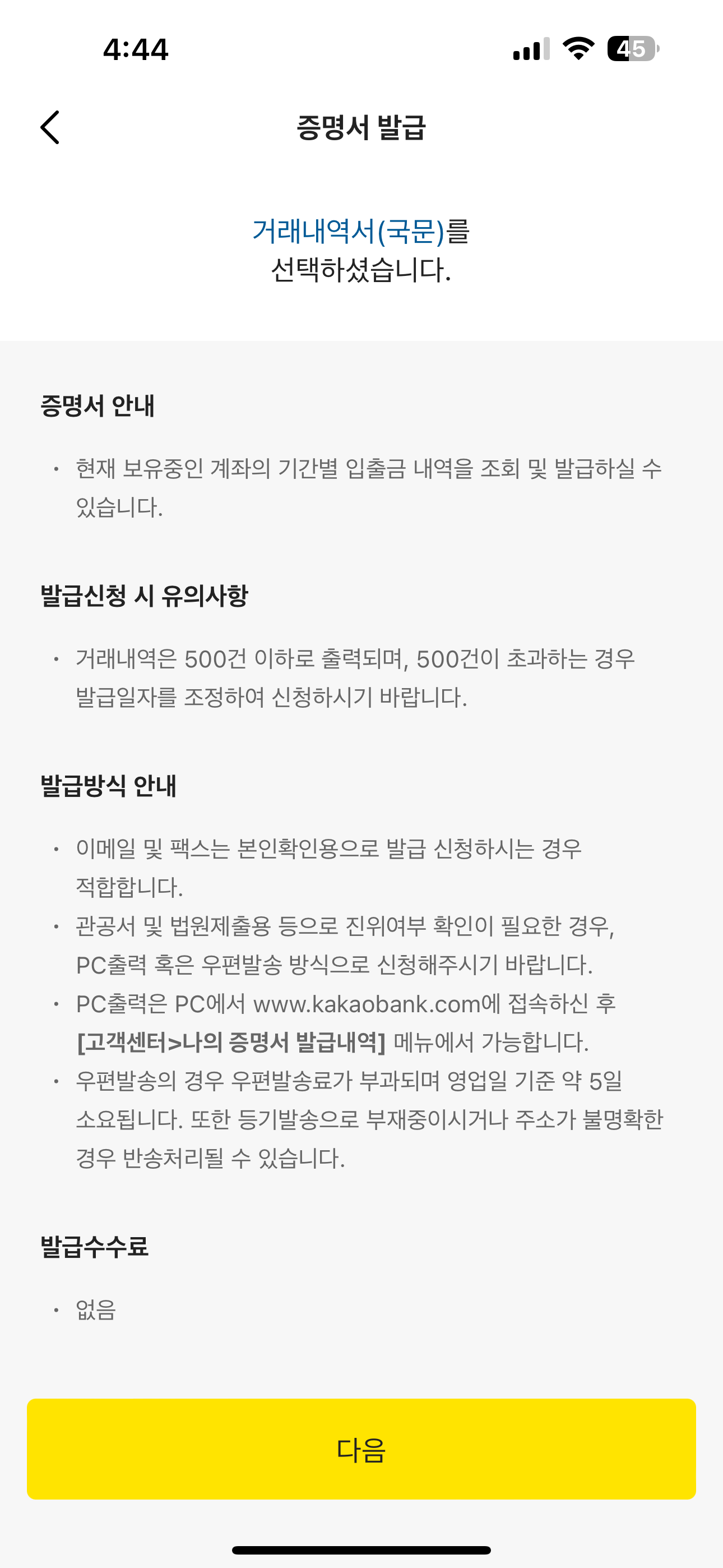 먼저 간단하게 요약을 해보자면, 카카오뱅크 앱에서 증명서 발급신청을 PC출력을 선택한 후