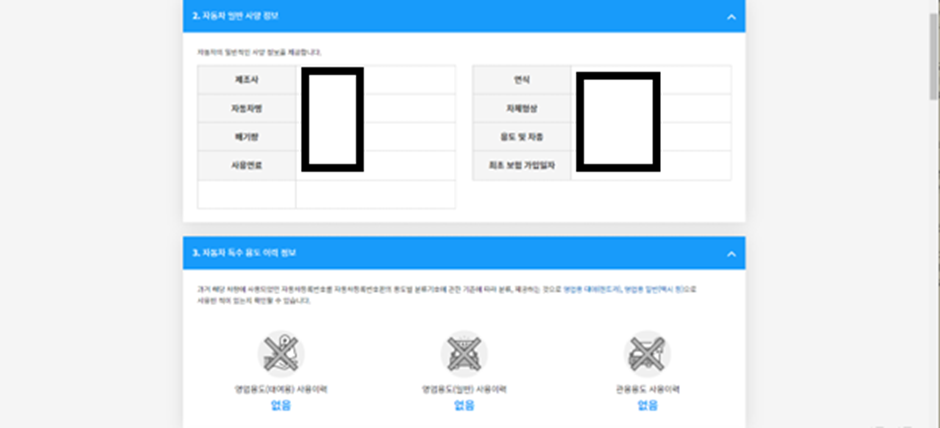 사고이력 조회를 하면 해당차량의 일반사양 정보와 특수용도 이력이 있는지 여부도 확인 가능합니다.