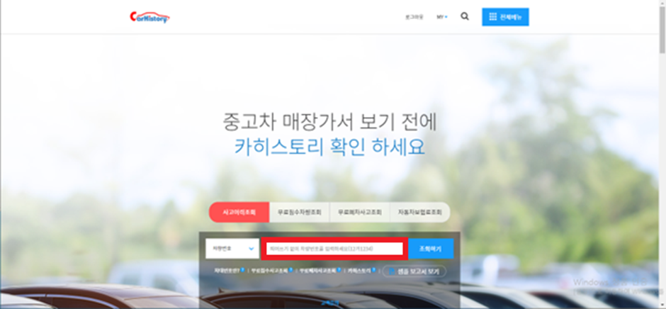 사고이력조회에서 조회하실 차량번호를 입력하고 조회하기를 클릭하시면 됩니다.