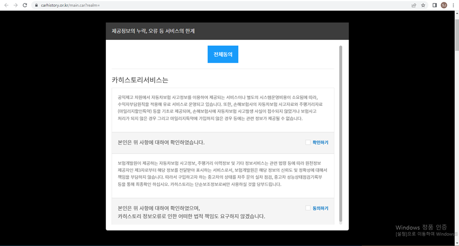 차량번호를 입력하고 조회를 하면 제공정보의 누락, 오류 등의 서비스의 한계에 대한 내용과 함께 해당내용을 확인했다는 동의를 해주셔야 합니다.