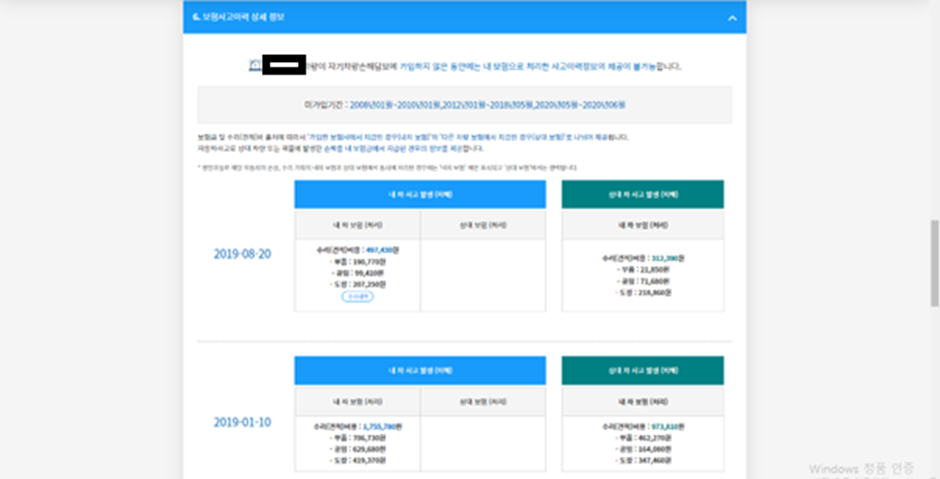 말그대로 보험사고이력이기 때문에, 보험처리를 하지 않은 사고는 확인할 수 없으며 보험사가 아닌 공제등에서 처리한 사고 또한 확인할 수 없습니다.