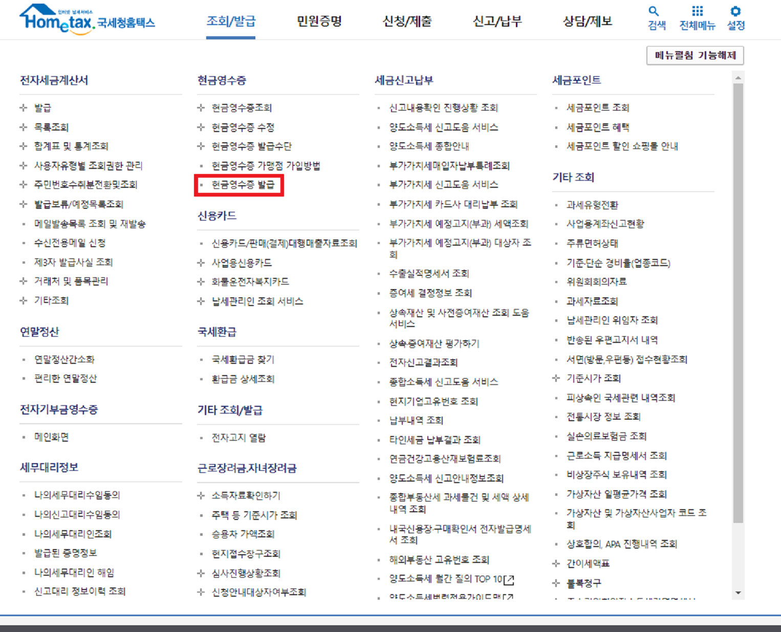 - 홈택스 → 조회/발급 → 현금영수증 → 현금영수증 발급 → 홈택스 발급 신청