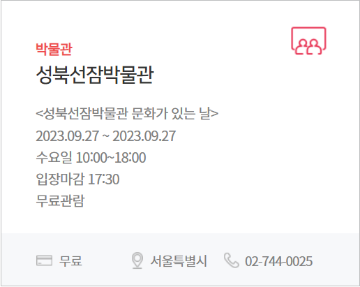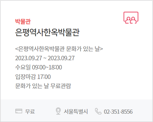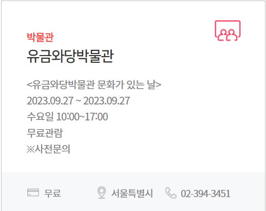 | 전 시 | 주요 전시시설 무료, 할인 등 (국립현대미술관, 국립중앙박물관 등 국·공·시립박물관) |
