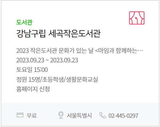 | 도서관 | 각 지역의 도서관에서 기획 프로그램 운영 |